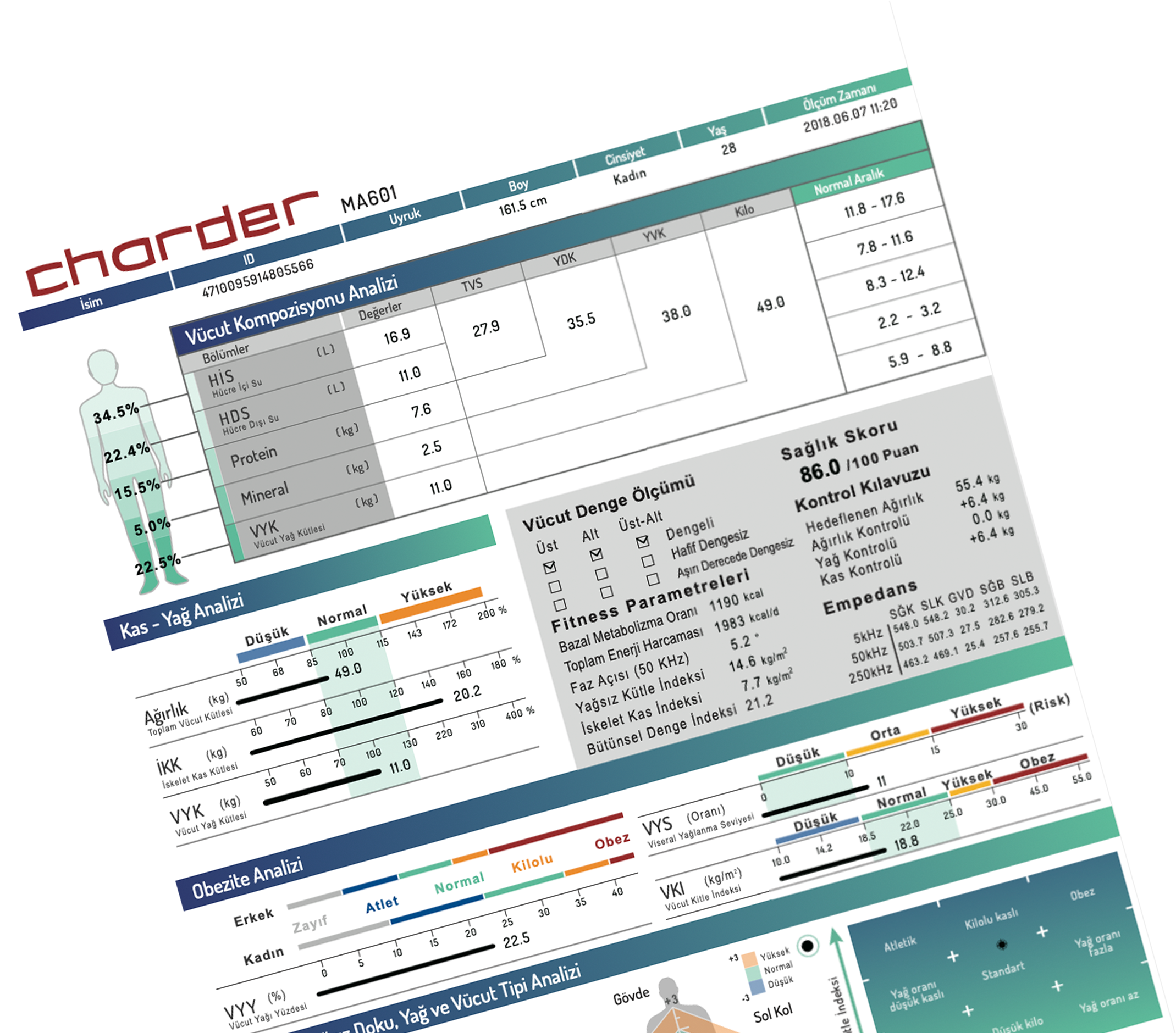 TALEP OLUŞTURVücut kompozisyonu analizi, vücut suyu, proteinler, mineraller ve yağlar arasında ayrım yaparak ağırlık ve BKI’nin ötesinde daha isabetli verilere ulaşmak adına vücudu meydana getiren maddelerin ne olduğunu betimler. Vücut kompozisyonu bileşenleri güçlü bir biçimde birbirinden farklı sağlık çıktılarıyla ilişkilidir ve söz konusu düzenli ölçüm pratiği, tıbbi uygulama alanında git gide artan bir biçimde değerlenmektedir. MA601 Profesyonel Vücut Kompozisyonu Analiz Cihazı, sağlık uzmanları tarafından kullanılabilecek ve hastanın durumunun takibinin yapılması ile teşhis, görüntüleme işlemlerine destek olacak nitelikte çok sayıda ölçüm değeri, veri ve önemli gösterge sunmaktadır. Çoklu ölçüm frekansları ve sofistike algoritmalarıyla Charder, güvenebileceğiniz sonuçlar için klinik çalışmalarla ve on yıldan uzun bir süredir gerçekleştirilen orijinal hakem değerlendirmeli bilimsel araştırmalarla ürünlerinin yanındadır.